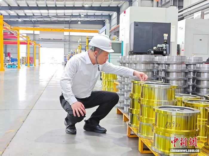 图为韩红安在厂区检查零件标准。 张楠 摄